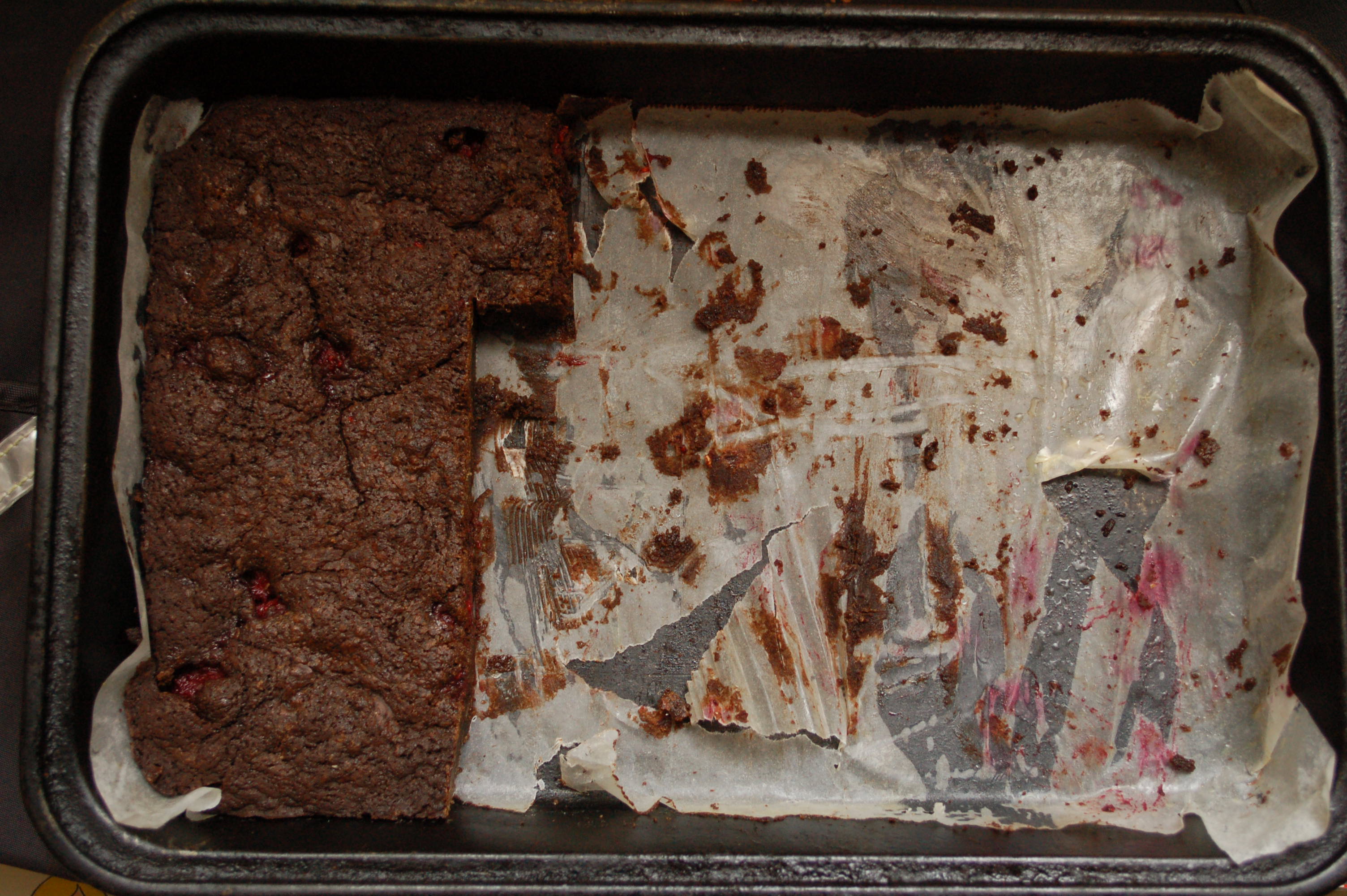 This recpie results in a fairly dense cake like brownie, which can be left a bit soft in the middle. I’ve added toasted walnuts and chili flakes as well as dark chocolate chunks. The recipe below is for a much denser slab of chocolate debauchery and on this occasion Shona threw in some frozen raspberries, fresh being a little sparse 11 degrees south of the equator. It sounds a bit wrong, but the tart little things cut through the fat rather well. I like putting a slab of this in some crusty white bread for breakfast.