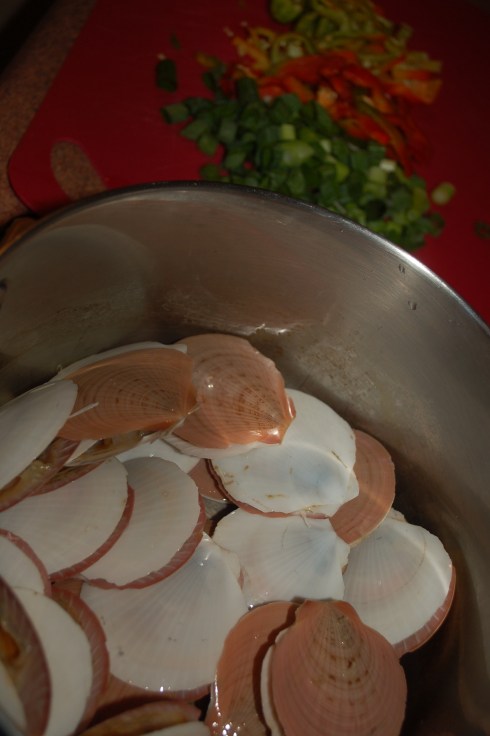 In Tasmania scallops are so ubiquitous that they make a dodgy lumo curry pie out of them. I suppose this is reminiscient of the use of oysters in blighty before they went posh. Well, a new shop at the Rapid Creek Sunday market had a bag of bivalves of some description, claiming to be scallops. $30 you say, er, maybe not, no $3- really? Well they smelt divine and looked gorgeous, sleek and very fine with almost transparent shells. They must be local, impossible to be that cheap otherwise. I must ask next time what they are called.
