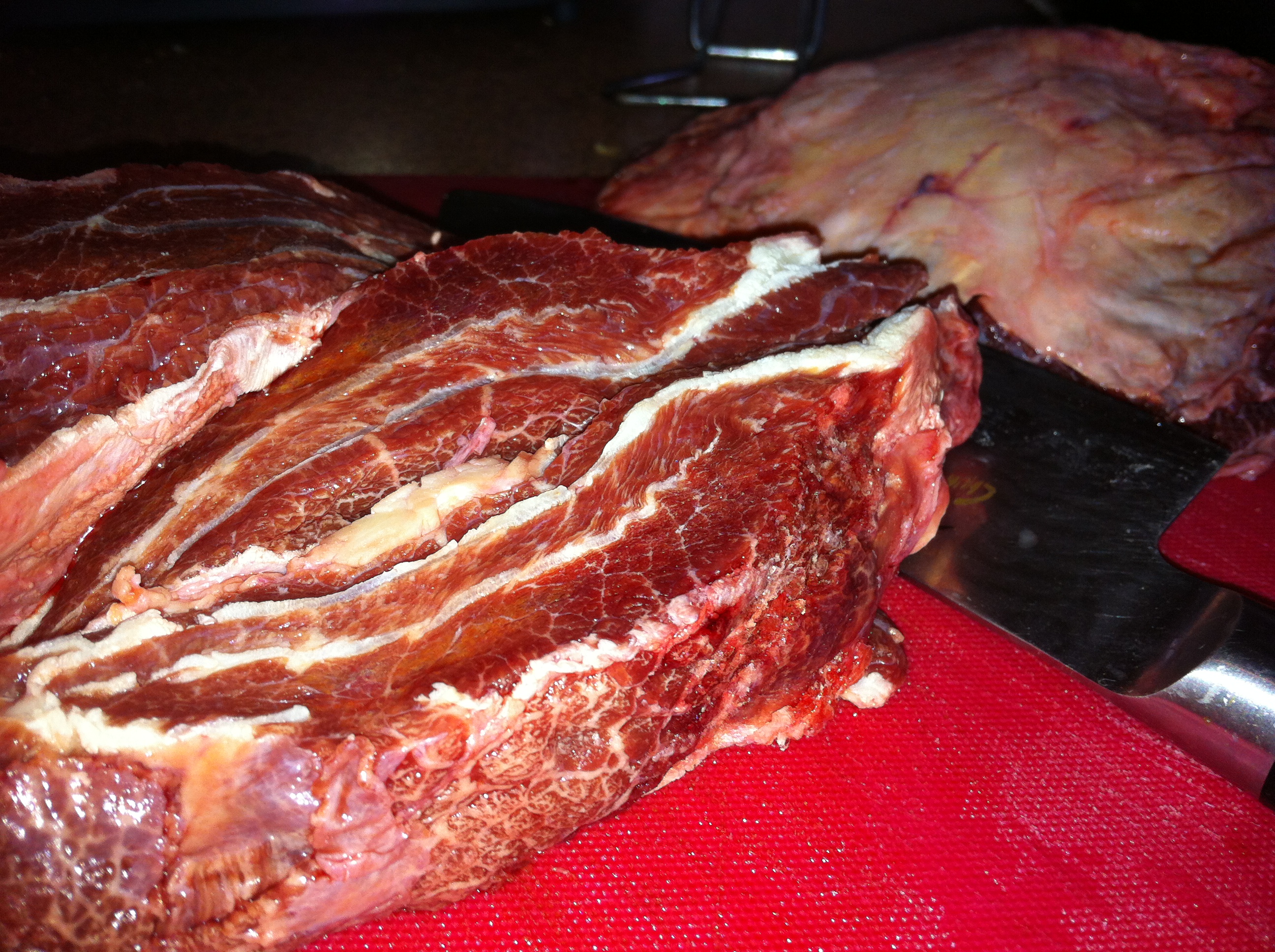 As you can see, these fellas are beautifully marbled and had copious chewy related connective tissue running through them- they might be the most resilient meat I’ve ever had the pleasure to slice. Even the Samurai knife had to be pushed through this with some effort.