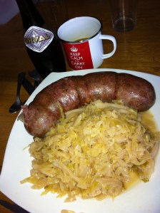 Anyway, it had a recipe for cotechino with cabbage that tickled my fancy. Now, I just happened to have a cotechino sausage in the freezer, acquired from the only venerable deli in Darwin, Parap fine foods (hence, for about 3000km). Cotechino is the Italian equivelent of haggis- it’s rude, it’s rich, and it’s a bit weird. Though not made from lovely offally bits, it does have a decent whack of pigs skin minced up with pork and spices. This is why you don’t see pork skin on pork cuts in Italy- it all goes into the cotechino and zampone. This latter product has the same integumental mix stuffed into a pigs trotter, slobber.
