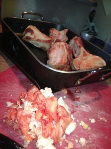 The bones I roasted and made a spiffing stock. Maybe next time I’ll do Fergus Henderson’s signature roast marrow bone salad. Oooh, some sourdough to smear that on would be divine…….