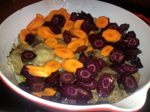 Now Woolies has a few things over Coles, and these veal osso bucco are one of them. The last OB’s I did was beef, and it suggested to me why veal is preferable for the wet stove fry method. The beef ones quite dried up and contorted by the time they were edible. These veal beauties were cooked in 1.5 hrs or so, stayed moist and didn’t buckle up over themselves. Just slow cooked adding only white wine, and then some bonkers purple carrots to cook as shown. Should have used the excess marrow above for a risotto Milanese……