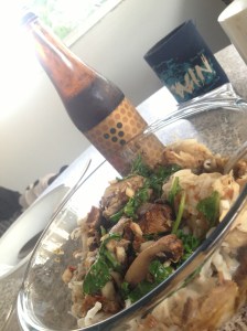 A fine name for a pub, though The Buff’n’Barra might be more appropriate here in the Top End. Better keep that from the ‘Hoff’, who’s apparently going to build a bar somewhere around here Casablanca style. Anyway, a classic leftover concoction here. We had an amazing sunset barbecue on Simon’s wee chunk of land here in Katherine, a 200acre nature playground. I took along a side of Barra kindly given by Mel, and we threw that on the hot plate over charcoal with no adornment. Most of it got left as the shoulder of pork was beautiful and even crackled successfully over hot coals. So tonight, on my tod, I made an Indonesian flavour noodle soup. I had some deeply amazing beef stock from some roast beef ribs (roasted 5 hrs) and a left over bit of ‘roo thigh bone. To this, some insane homemade paste from out local shop in Wanguri, weirdly, which must have chillies, shallots and balacan (fermented prawn brick) amongst other unknowns. I had some leftover fatty rib meat, the barra, a mushroom, some rice and mung bean noodles and some spinach and rocket mix which I just put in the end to wilt. Washed down with Vale/Dark as shown. Glorious.